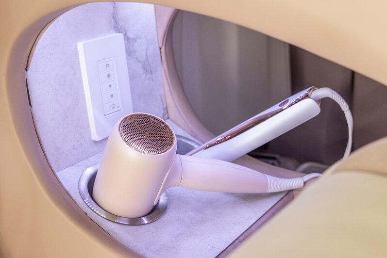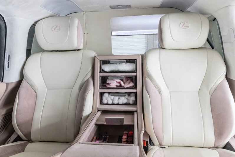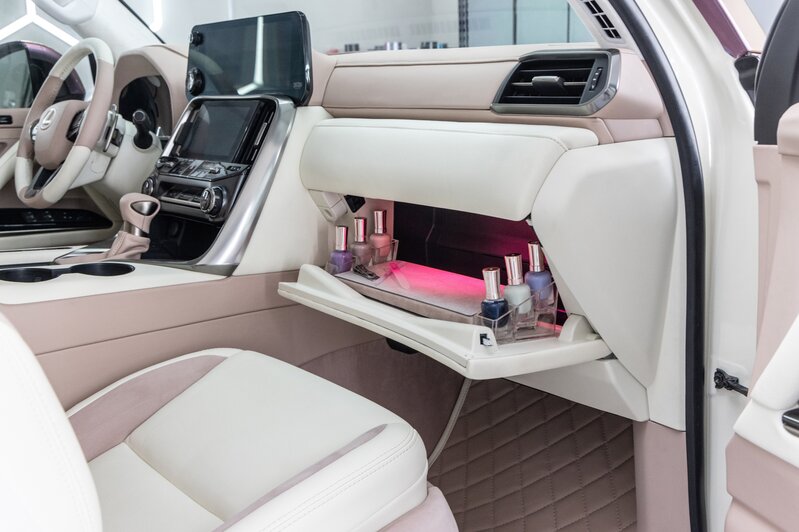 Wnętrze Lexus Glam LX zachwyca dbałością o szczegóły. Biało-różowa skóra łączy się tu z jedwabiem i moherem, a funkcjonalność jednoznacznie podporządkowano „beauty trybowi”: znajdziemy uchwyty na suszarkę, chłodzony schowek na kosmetyki, zmodyfikowane stoliki do makijażu oraz podświetlane wnęki na torebki. Nawet bagażnik stał się mobilną garderobą – z wieszakami, półkami na buty i lustrami z podświetleniem konturowym.
