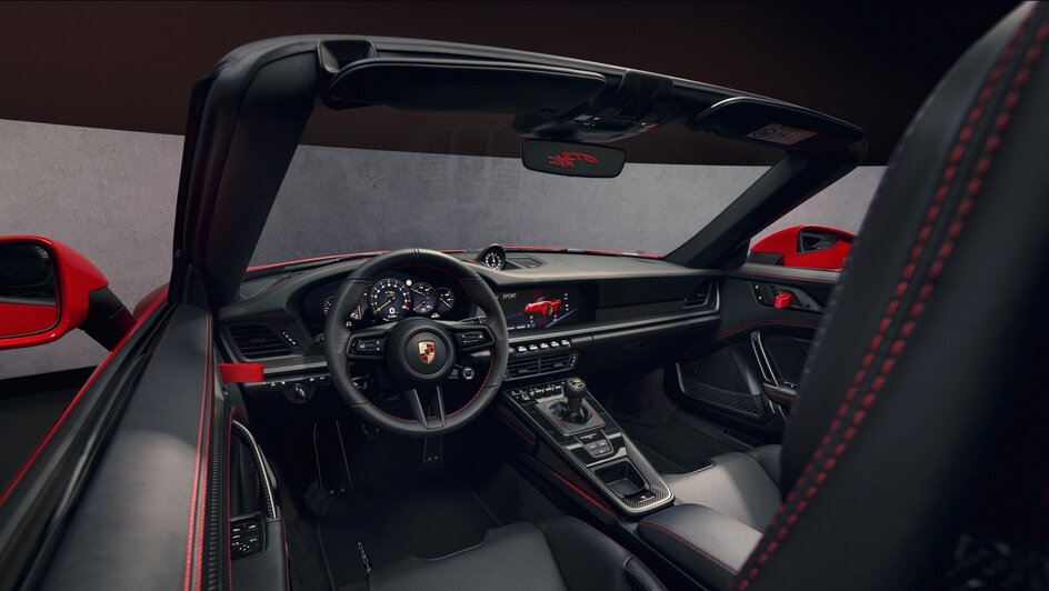 Wnętrze również podporządkowano idei odchudzania. Zastosowano minimalistyczne rozwiązania znane z 911 S/T, takie jak tekstylne uchwyty drzwi i elementy z karbonu, a tylna kanapa została całkowicie usunięta. Kabriolet oferowany jest wyłącznie jako dwumiejscowy, z opcjonalnymi fotelami kubełkowymi i dodatkowymi akcentami torowymi. Materiałowy dach z magnezową konstrukcją składa się automatycznie w 12 sekund przy prędkości do 50 km/h.