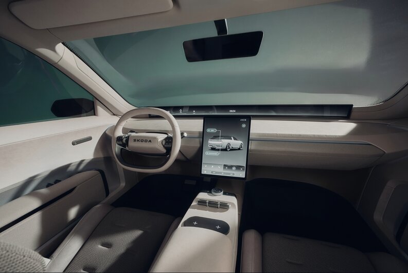 Wnętrze również zaskakuje: przed kierowcą znajduje się ekran o szerokości 1,2 metra, uzupełniony centralnym wyświetlaczem dotykowym. Systemem multimedialnym można sterować nie tylko za pomocą ekranu, lecz także pokrętła na konsoli środkowej lub asystenta głosowego Laura. Kabina została wykonana z materiałów z recyklingu, a ażurowe zagłówki wydrukowano w technologii 3D. Klimat wnętrza podkreśla adaptacyjne oświetlenie, a rozwiązania Simply Clever obejmują wysuwane uchwyty na napoje w drzwiach, wbudowaną lodówkę, przenośny głośnik Bluetooth oraz bagażnik o pojemności 650 litrów.
