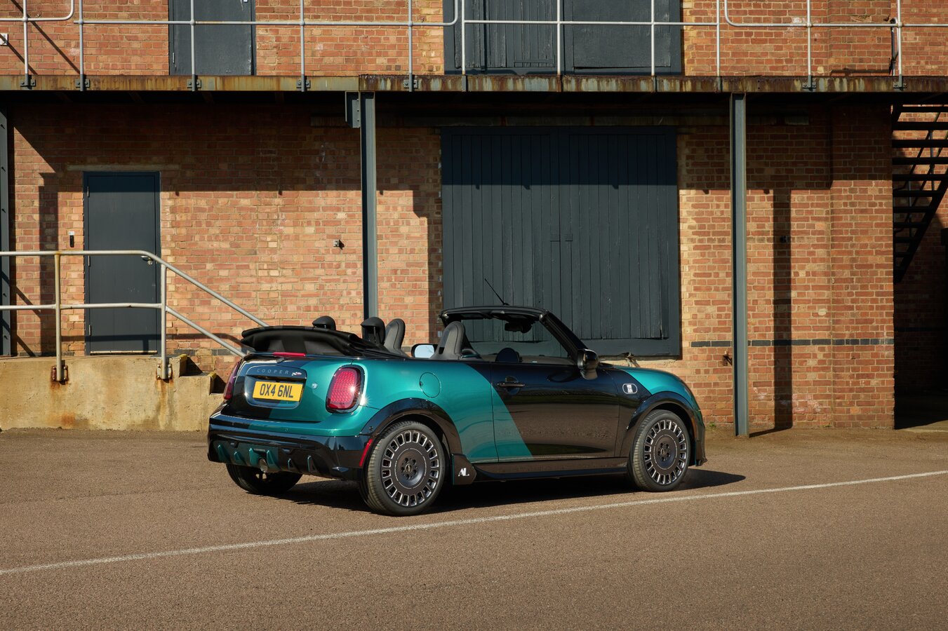 Mini.01 natychmiast przyciąga uwagę asymetrycznym lakierem: zielony metalik zestawiono z czarnymi segmentami Midnight oraz białymi akcentami na lusterkach i felgach JCW Rallye Spoke. Brytyjska flaga na miękkim dachu oraz elementy aerodynamiczne podkreślają ekskluzywny charakter. Wnętrze wykończono skórą w odcieniach granatu i czerni, uzupełnioną zielonymi detalami i logotypami projektu.