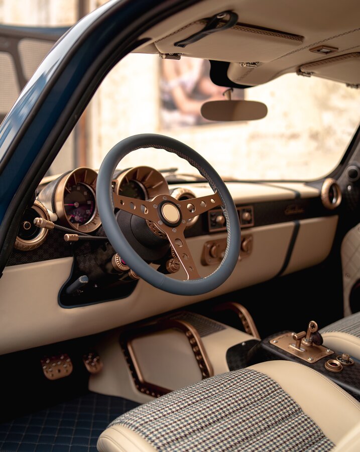 Wnętrze dopracowano z równie dużą dbałością o detale. Zegary z matowo-złotymi obramowaniami, trójramienna kierownica obszyta niebieską skórą oraz oryginalne przełączniki tworzą klimat ręcznego rzemiosła. W wykończeniu szeroko wykorzystano karbon o nietypowym splocie, a główną część kabiny pokryto połączeniem niebieskiej i kremowej skóry nappa. Sportowe fotele Sabelt z karbonowym stelażem podkreślają ekskluzywny charakter auta.