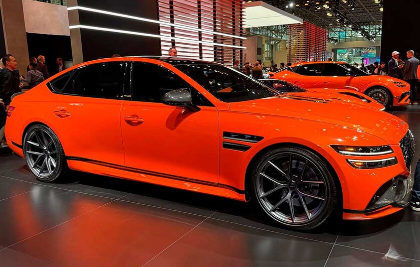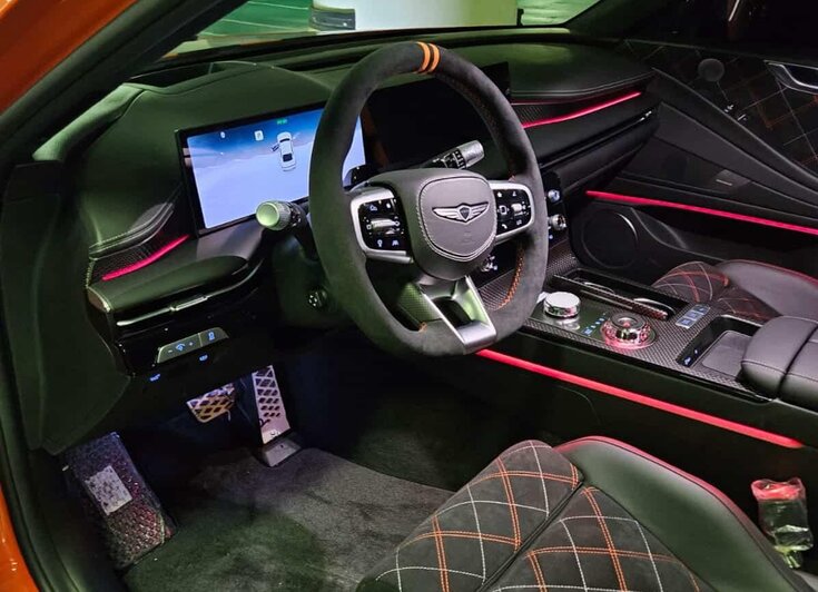 Wnętrze utrzymano w równie sportowym tonie. Kabinę wykończono czarną alcantarą z kontrastowym pomarańczowym przeszyciem, zamontowano kubełkowe fotele Recaro, elementy dekoracyjne z karbonu oraz pomarańczowe pasy bezpieczeństwa. Efekt jest zdecydowanie bardziej dynamiczny niż w standardowym G80, bez rezygnacji z premium.