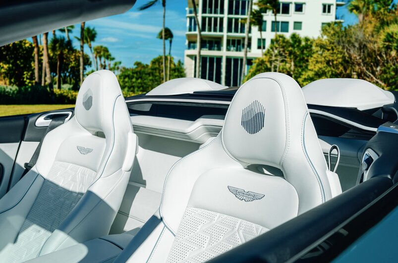 Motyw morski kontynuowany jest również we wnętrzu. Pomarańczowym kolorem wyróżniono pokrętło uruchamiania silnika na tunelu środkowym, a fotele ozdobiono ekskluzywnym haftem w niebieskim odcieniu. Wszystkie detale dobrano tak, aby podkreślić wyjątkowy charakter jedynego w swoim rodzaju egzemplarza, nie naruszając przy tym charakterystycznej dla Aston Martina elegancji.
