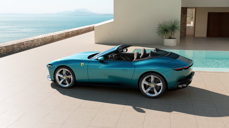 Wnętrze utrzymano w układzie „2+” i wyposażono w nowoczesne technologie. Kierowca ma do dyspozycji cyfrowy zestaw wskaźników, centralny ekran multimedialny oraz dodatkowy wyświetlacz dla pasażera. System Manettino umożliwia wybór trybów jazdy, a pakiet systemów wsparcia obejmuje adaptacyjny tempomat i zaawansowane systemy bezpieczeństwa.