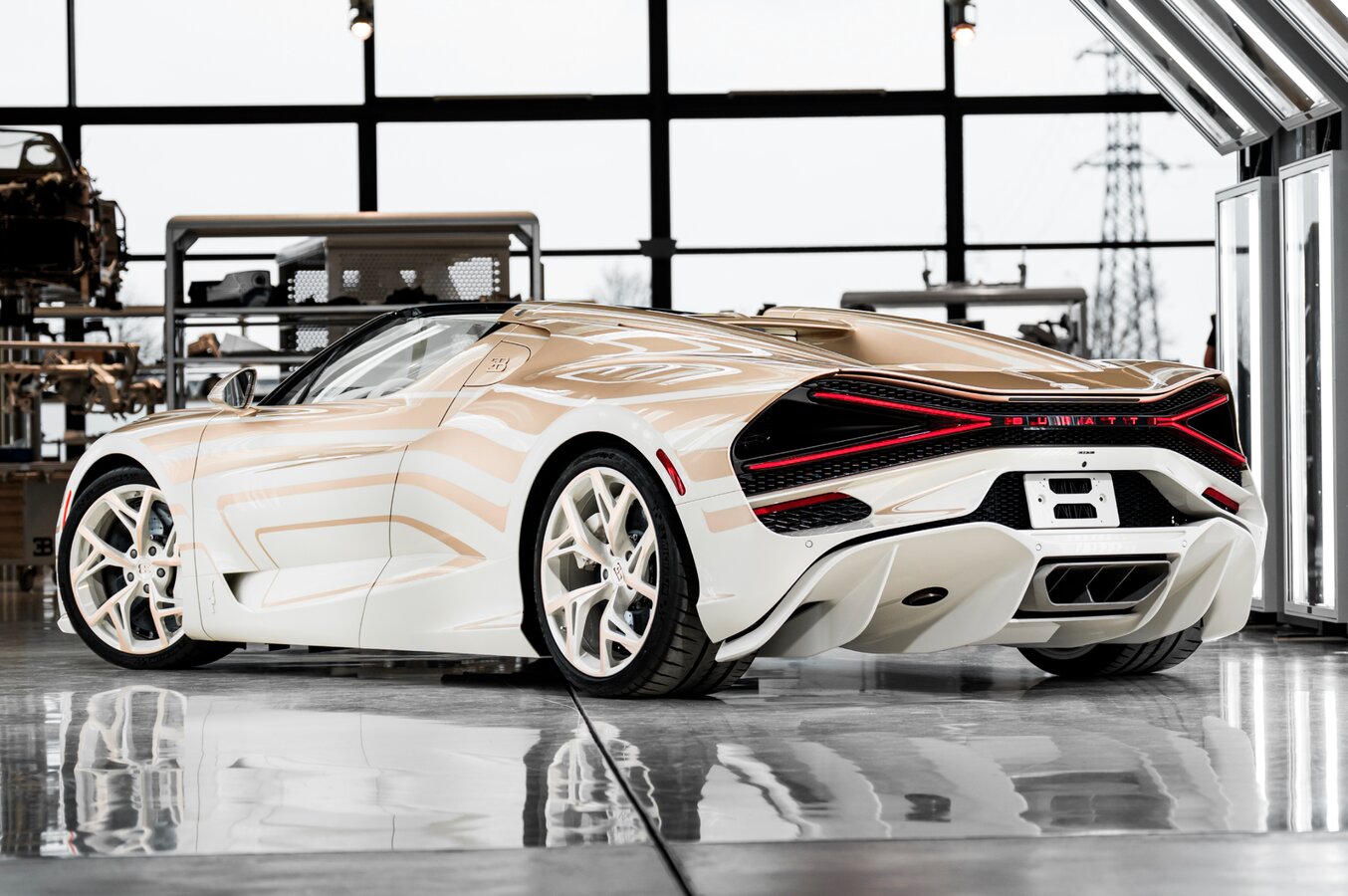 Głównym akcentem jest unikatowa kolorystyka inspirowana zjawiskiem Vagues de Lumière, czyli świecącymi falami wywołanymi bioluminescencją planktonu. Nadwozie ręcznie pokryto specjalnie opracowanymi odcieniami białej perły i złotego metaliku — prace trwały setki godzin. W tej samej tonacji utrzymano kute felgi z diamentowym szlifem, podkreślające „perłowy” charakter auta.