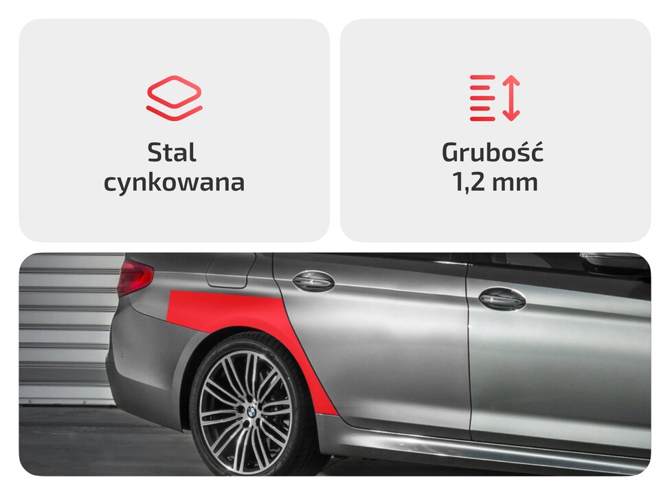 Zestawy naprawcze nadkola tylnego wykonane są z wysokiej jakości stali ocynkowanej o grubości 1,2 mm, gwarantującej żywotność do 10 lat lub 5-10 razy dłuższą niż części wykonane z konwencjonalnej stali walcowanej na zimno.
