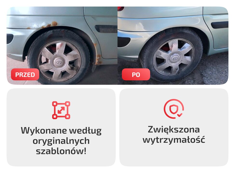 Zestawy naprawcze nadkola tylnego wykonane są z wysokiej jakości stali ocynkowanej o grubości 1,2 mm, gwarantującej żywotność do 10 lat lub 5-10 razy dłuższą niż części wykonane z konwencjonalnej stali walcowanej na zimno.